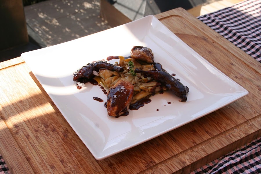 Regamos con un poco de salsa, poner sal maldon encima de la codorniz y decorar con una flor de tomillo