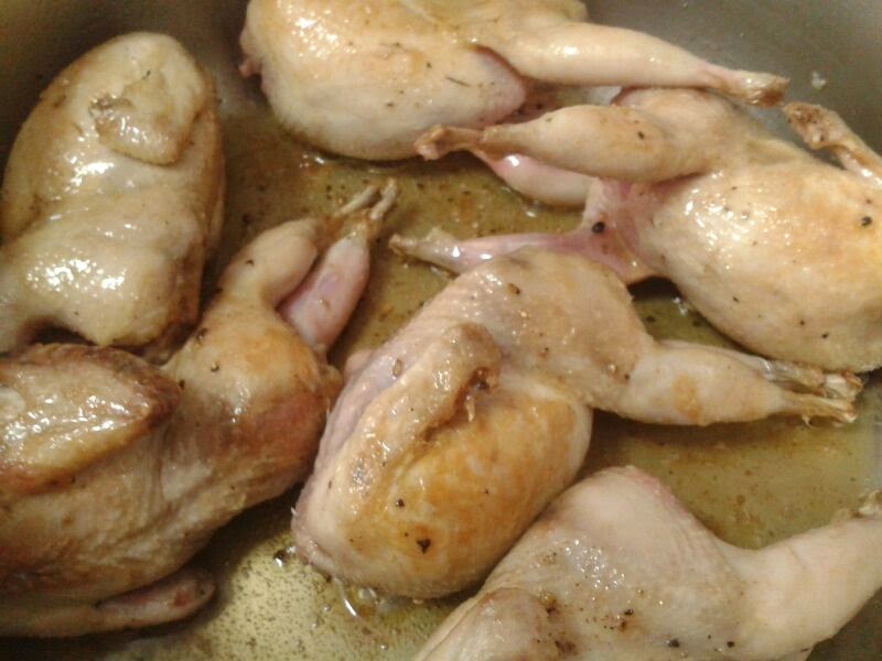 Limpiamos bien las codornices de las posibles plumas que puedan quedar. Las salpimentamos y en el mismo aceite las rehogamos hasta que tomen un bonito color dorado.