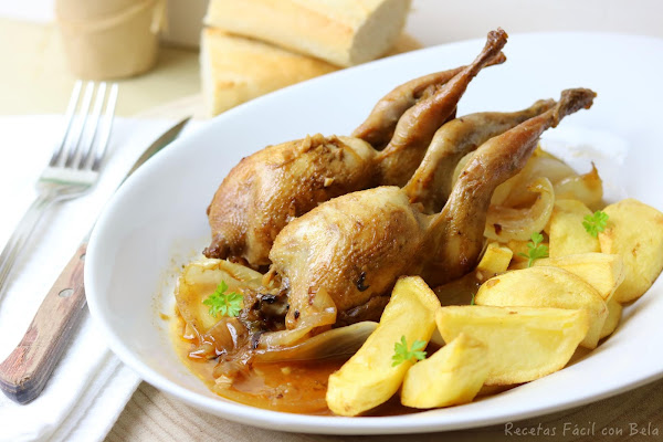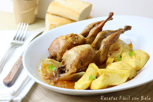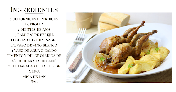 Ingredientes: 6 codornices o perdices, 1 cebolla, 2 dientes de ajo, 3 ramitas de perejil, 1 cucharada de vinagre, 1/2 vaso de vino blanco, 1 vaso de agua o caldo, Pimentón dulce (medida:1/2 cucharada de café), 3 cucharadas de aceite de oliva, un trozo de miga de pan, sal.