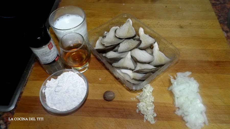 1º Prepararemos la crema para el relleno en el que haremos un fondo con la cebolla y ajos finamente cortado. Agregamos las setas y flambeamos con el brandy