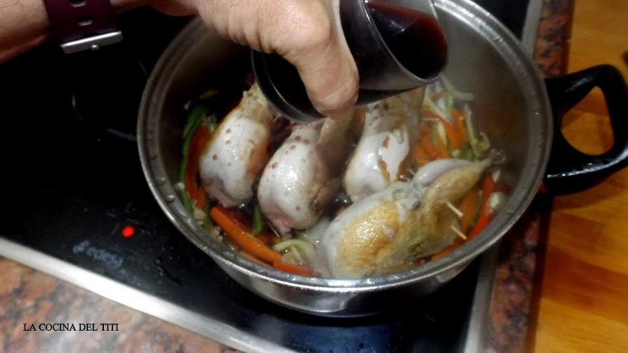 6º Incorporamos las codornices al fondo y bañamos con el Rioja dejamos reducir el vino