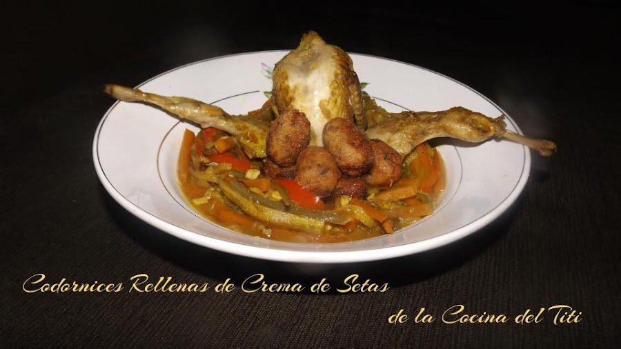 Que tal, hola a todos como estais, hoy traigo una pequeña ave familia de las galliforme, se trata de la codorniz y vamos a rellenarlas con una crema de setas de cardos la cocinaremos con un variado de julianas de verduras bañada por un buen Rioja. Con la crema sobrante para el relleno que casi seguro os sobrara podeis hacer unas pequeñas croquetas que estoy seguro que os vais a deleitar con una autentica exquisitez y que incluso le va dar un toque muy bonito al nido de verduras con la codorniz al medio y las croquetitas.