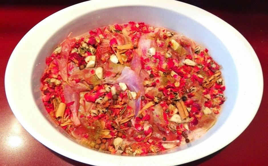 Limpiamos las codornices y las ponemos abiertas. Las colocamos en un recipiente grande y les echamos el agua de rosas, las rosas secas, los ajos, la canela, el comino, la pimienta y el zumo de limón. Las maceramos durante 1 hora. Reservamos.