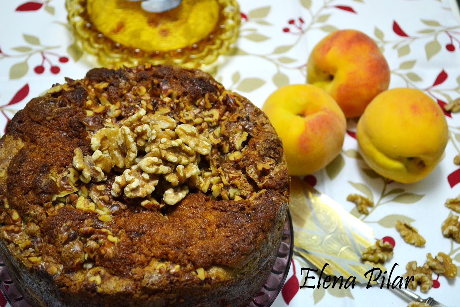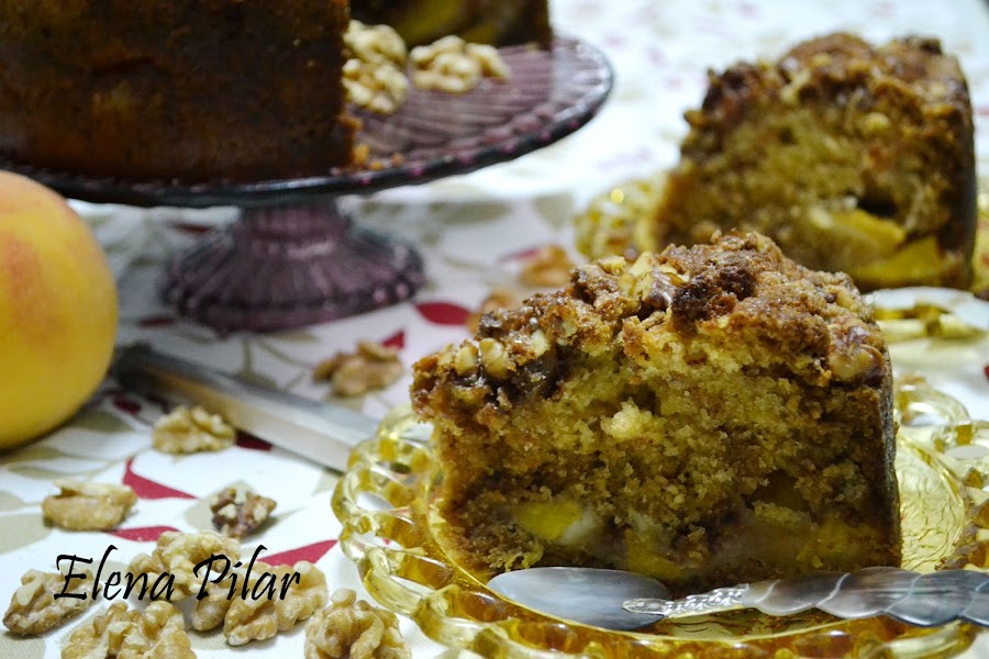 Ahora que ha empezado a refrescar me apetecía un té bien calentito (hasta ahí, todo bien; en mi casa nunca falta el té), pero quería acompañarlo de un coffee cake. Sí. Tenía que ser un coffee cake. No podían ser unas pastitas o unas galletas, no. Un coffee cake. Más en concreto. Tenía que ser de melocotón y nueces, exactamente uno que había visto en el blog Brown Eyed Baker.
