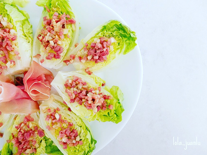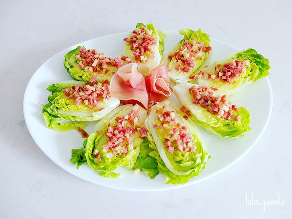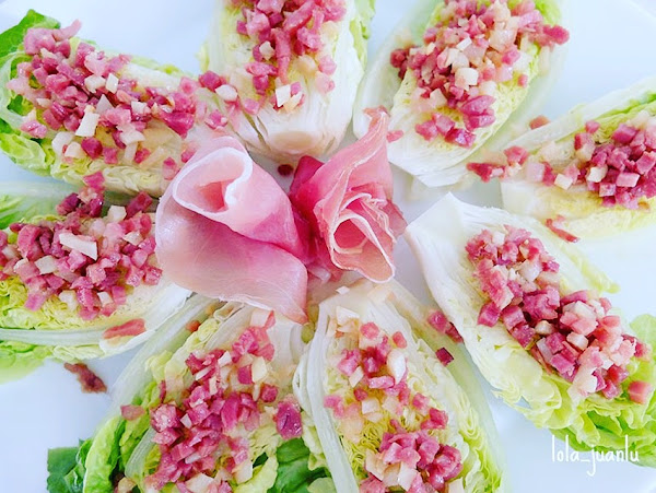 Ponemos los medios cogollos sobre un plato o fuente de presentación y, con ayuda de una cuchara, repartimos la vinagreta sobre los cogollos. A continuación, hacemos lo mismo con el preparado de ajo y jamón. Para finalizar, formamos unas flores con las lonchas de jamón y las colocamos en el centro del plato. Lo llevamos a la mesa.