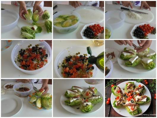 Colocamos los cogollos en un plato, le ponemos un trozo de queso fresco encima, que no sobresalga mucho, 1 o 2 anchoas en función del tamaño y aliñamos bien, con abundante vinagreta.