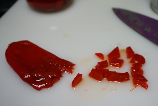 Cortaremos el queso de rulo de cabra en rodajas, el pimiento en tiras o trozos y las aceitunas en rodajas.