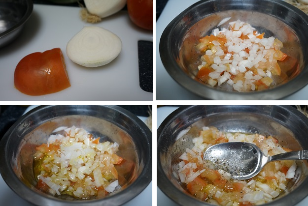Preparamos la vinagreta. Cortamos el tomate en trozos pequeños, la cebolleta, vamos poniéndolo en un bol, añadimos el aceite, el vinagre, un poco de sal y pimienta. Mezclamos. Las proporciones serán una cucharada de vinagre por tres de aceite.