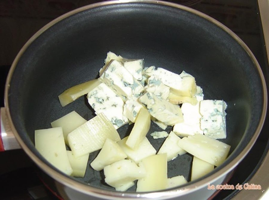 Para la crema: En un cacito fundir el cabrales y el queso manchego tierno con la nata (crema de leche). Se deja reducir y se enfría un poco, hasta obtener una salsa templada.