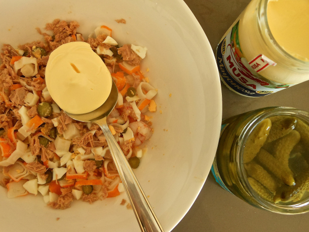 A continuación mezcla todos los ingredientes con las dos cucharadas de mayonesa.