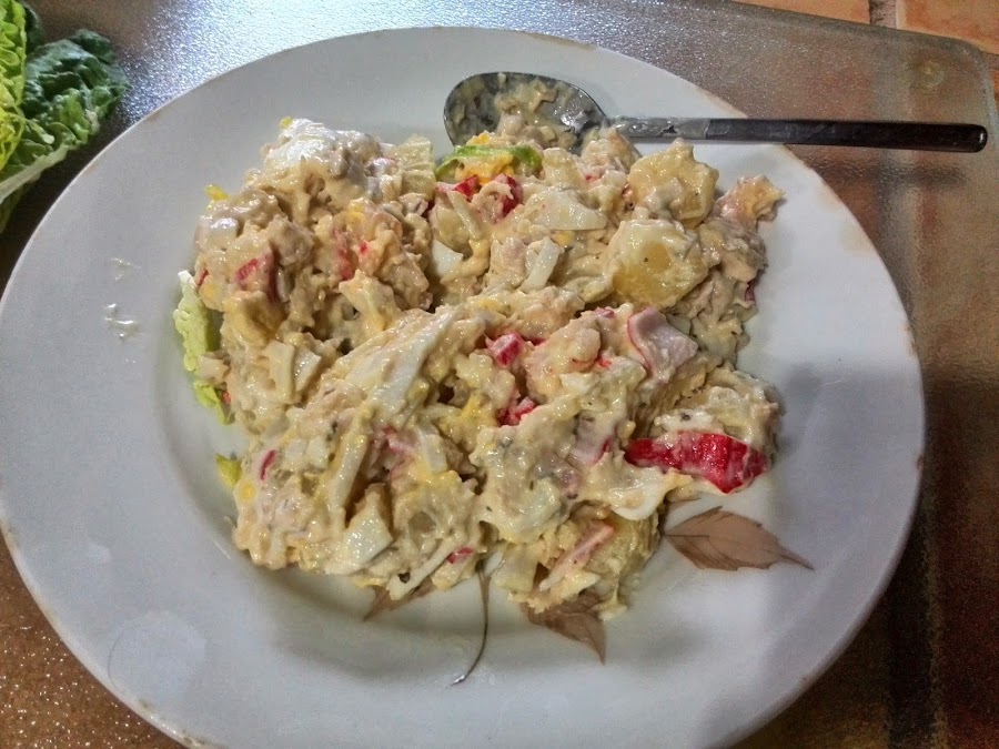 Juntamos todo con una lata de atún y unos palitos de cangrejo y le ponemos unas cucharadas de salsa de yogurt, mahonesa, ali oli....al gusto de cada uno.