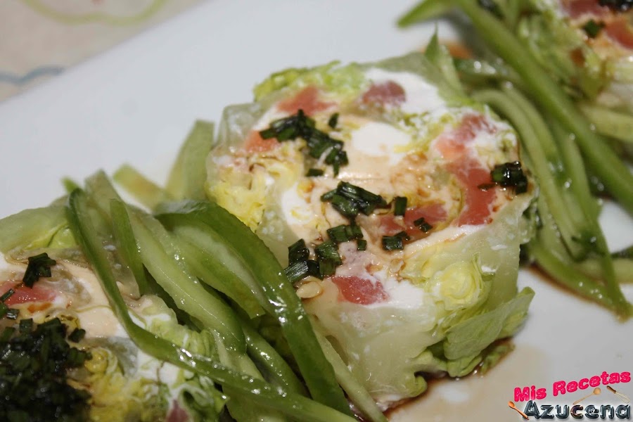 Ya tenemos todos los ingredientes listos solo nos falta montar el plato, cogemos un cogollo y sin quitarle el films transparente le cortaremos un trozo por la parte del tronco y otro por la parte del cogollo, estos no los cortaremos muy grandes pues son para desecharlos, lo que queda del cogollo lo cortaremos en dos medallones, los ponemos en el plato que tengamos pensado presentarlo y en el centro le pondremos pepino, por último le ponemos un poco de vinagreta por encima.