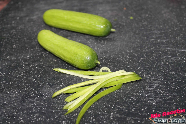 Ahora con ayuda de una mandolina o a mano cogeremos los pepinos y los picaremos en juliana fina, no utilizaremos la parte de las semillas, reservamos.