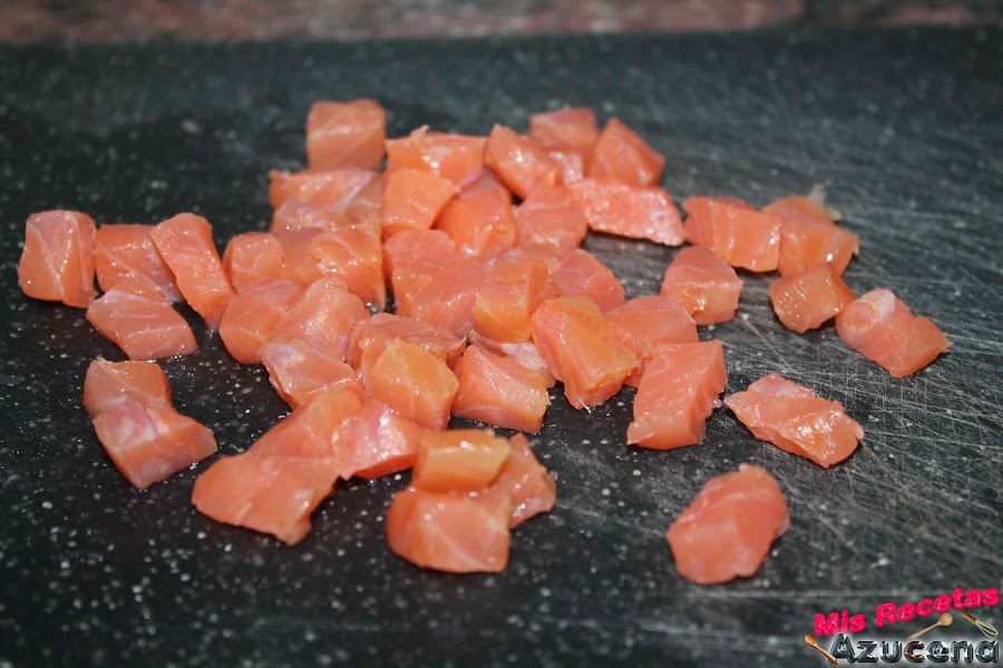El salmón lo compraremos a ser posible en un taco, no en filetes, lo picaremos en cuadrados.