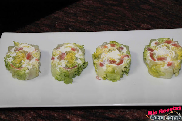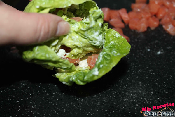 Cogemos un cogollo con nuestras manos abriremos el centro del cogollo y con ayuda de una cuchara de postre le iremos introduciendo queso y salmón entre las hojas del centro, cuando lo tangamos relleno cerraremos la hojas y haremos un poco de presión.