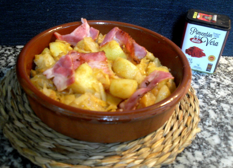 Agregar a la sartén el pimentón de la Vera, remover, agregar la col con patatas y rehoga durante unos minutos que se mezcle todo bien.