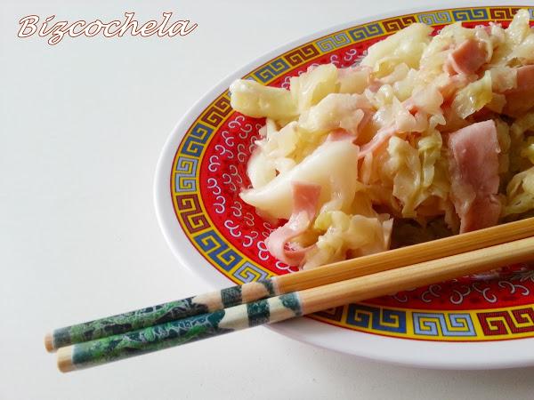 5. - Y en el último momento, cuando la col esté a nuestro gusto, a mi personalmente me gusta al dente, le añadimos el jamón, le damos un par de vueltas y servimos. Y si queréis lo podéis rociar con un poco de aceite de sésamo.