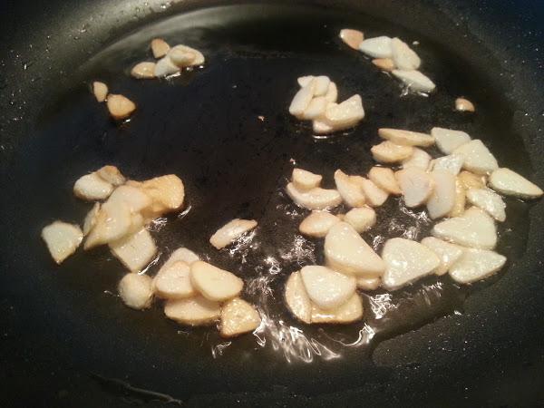 1. - Pelamos y cortamos en láminas los ajos y los ponemos en una sartén amplia con un poco de aceite.