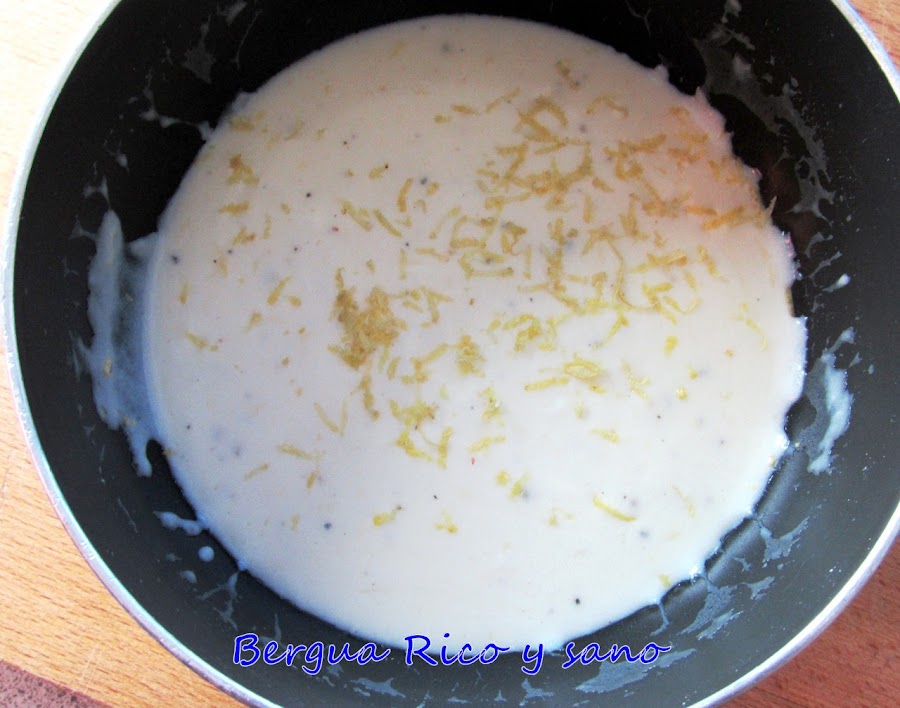 6. Pasado ese tiempo añadimos el queso crema, la ralladura de limón, la sal y la pimienta negra. Seguimos removiendo hasta que espese, serán un par de minutos. Retiramos del fuego y reservamos.