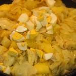 En una sartén amplia ponemos tres cucharadas de aceite y doramos los ajos bien picaditos. Añadimos el repollo troceado, la patata en medias rodajas gruesas y el huevo picado groseramente y le damos a todo junto unas vueltas.