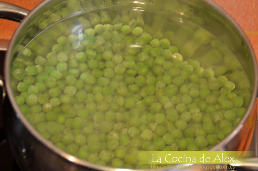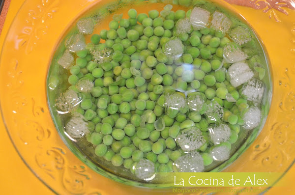 PREPARACIÓN:Lo primero que prepararemos será la espuma/crema de guisantes para que repose el tiempo necesario. En un cazo con agua hirviendo con un poco de sal ponemos los guisantes a cocer hasta que estén tiernos. Una vez estén tiernos los escurrimos y los metemos en agua con hielo para cortar la cocción y que no pierdan el color verde. Reservar.