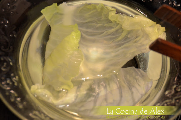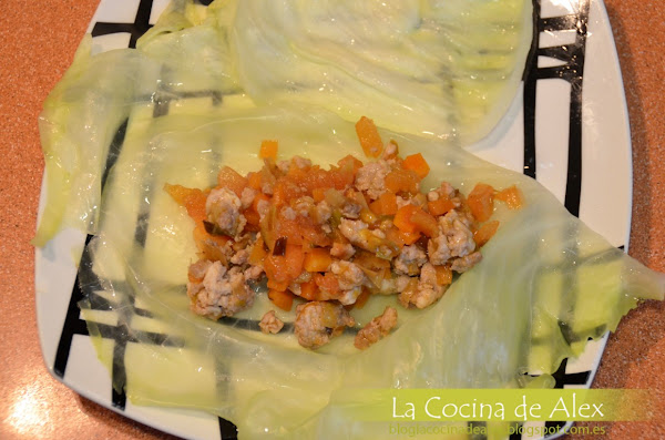Para montar la col, cogemos una hoja ponemos un poco del relleno y enrollamos hasta formar un paquete. Reservar.