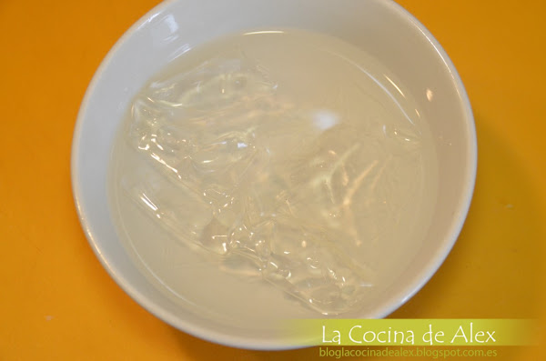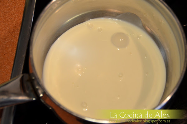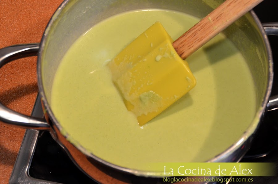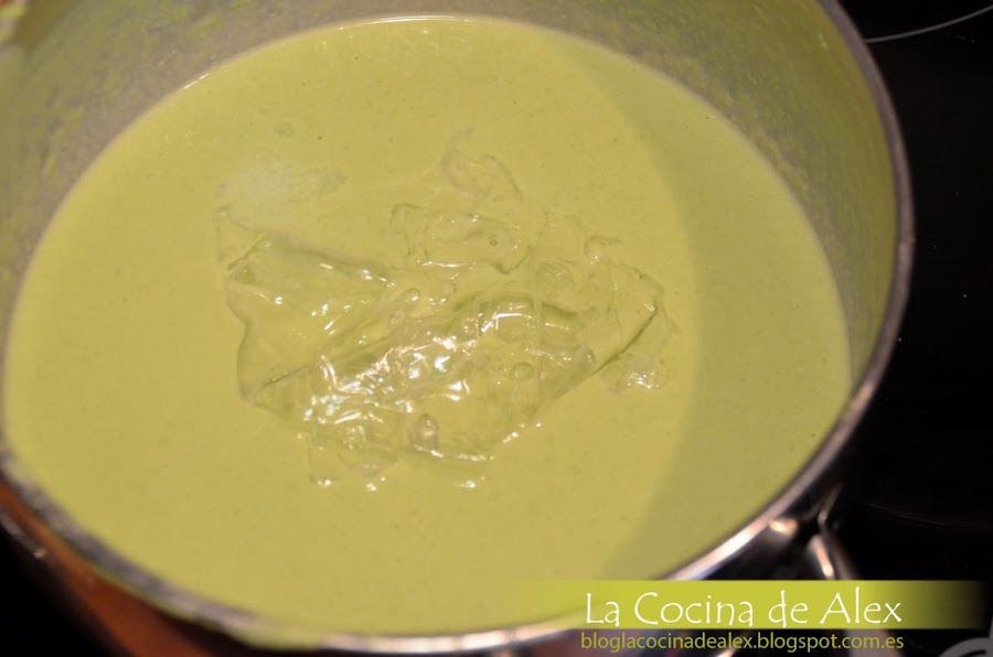 Hasta aquí ya tendríamos lista la crema, si queremos hacer la espuma tenemos que pasar esta crema por un colador fino para quitarle todos los grumos posibles. Ponemos a calentar el resultado en un cazo y cuando este caliente incorporamos las hojas de gelatina, previamente hidratadas en agua fría y escurridas. Removemos para incorporar todo.