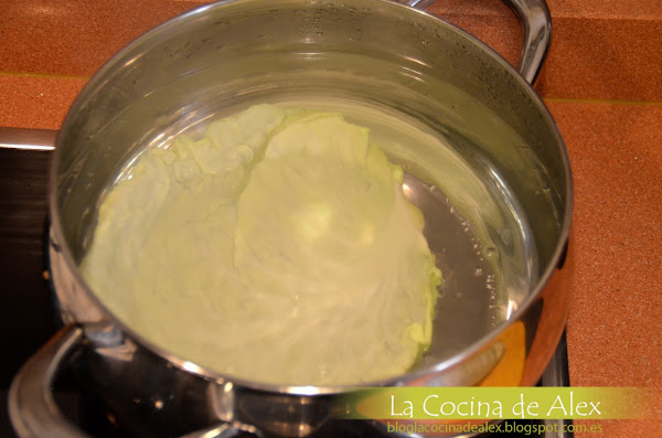 Para hacer la col rellena, separamos con cuidado las hojas de la col intentando que salgan lo más enteras posibles y las escaldamos en agua hirviendo con sal durante 2-3 minutos (se quedan un poco transparentes). Cuando estén tiernas, las sacamos a agua fría para cortar la cocción y reservamos.