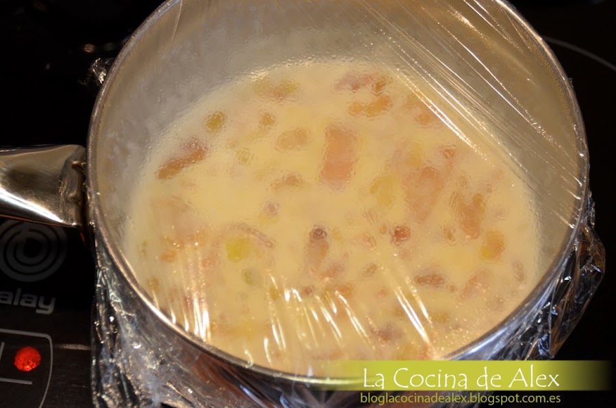En un cazo ponemos la nata (crema de leche) a cocer y cuando este hirviendo retiramos del fuego, incorporamos el puerro y el tocino pochados, tapamos con un film y dejamos infusionar 5-10 minutos.