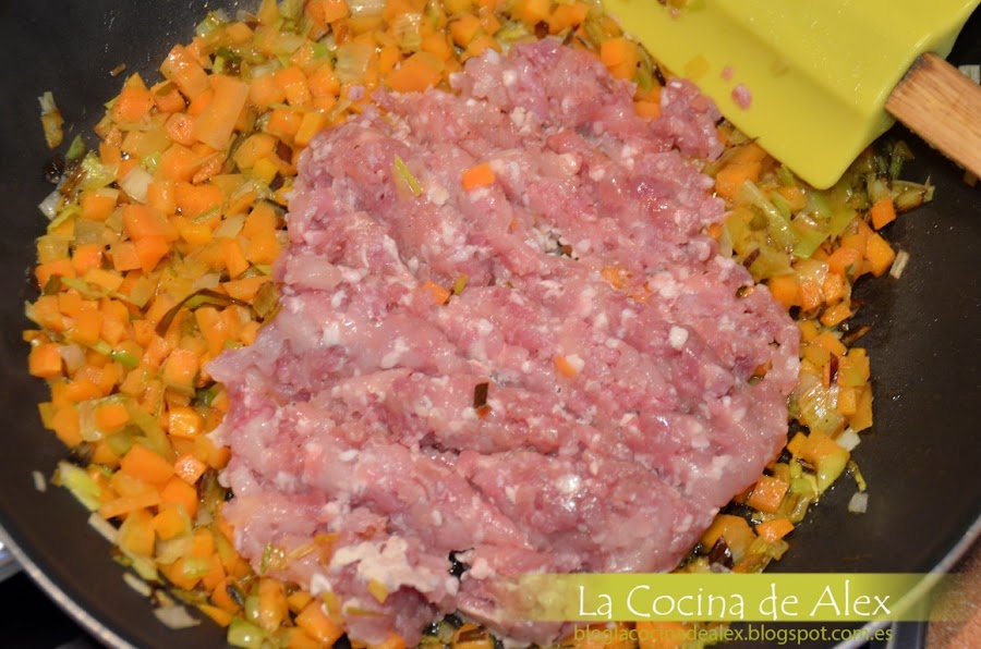 Cuando esté un poco dorado, añadimos la carne picada cocinando todo junto unos minutos.