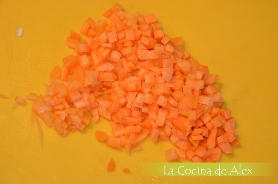 Para el relleno, lo primero que haremos será cortar el puerro, la zanahoria, el tomate pelado y salpimentar la carne picada.