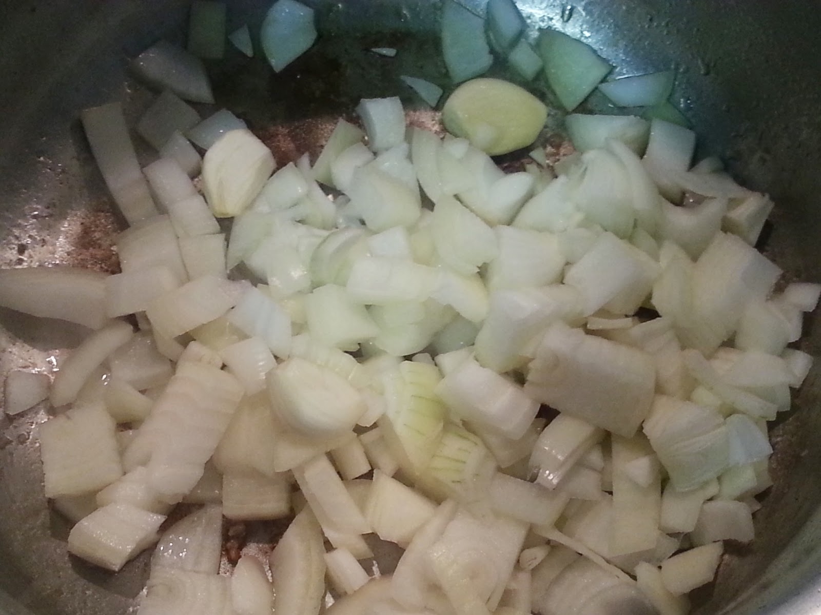 3. - Una vez dorados los sacamos y echamos en la olla la cebolla picada con los dientes de ajos pelados pero enteros. Y lo rehogamos.