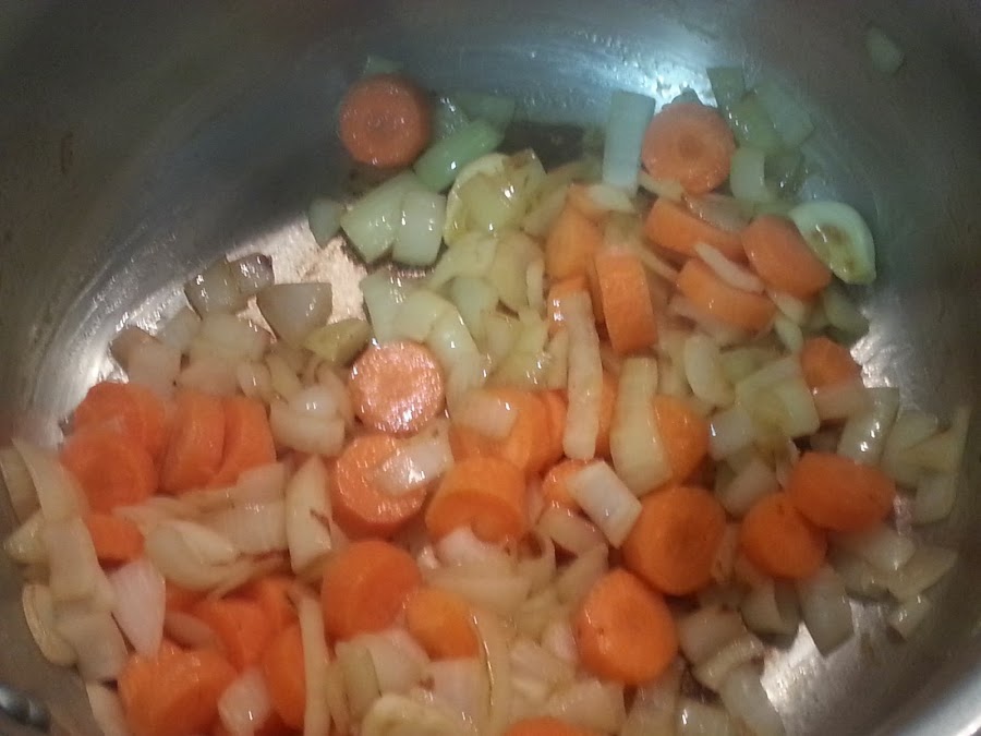 4. - Cuando la cebolla empiece a estar doradita, le añadimos la zanahoria pelada y cortada en rodajas, removemos un poco.