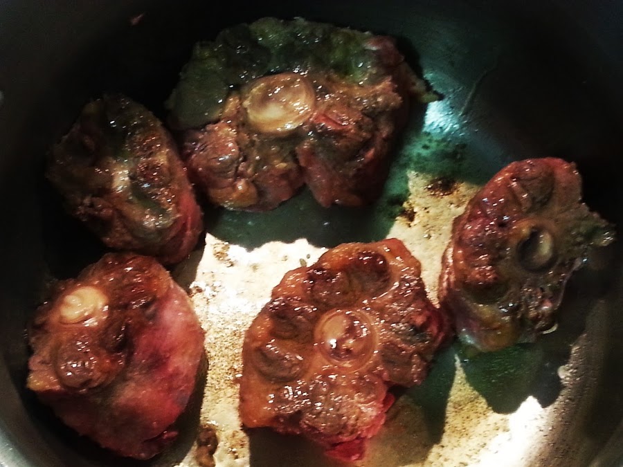 2. - Ponemos aceite que cubra el fondo de una olla express a fuego fuerte y ponemos los trozos de cola, para sellarlos.