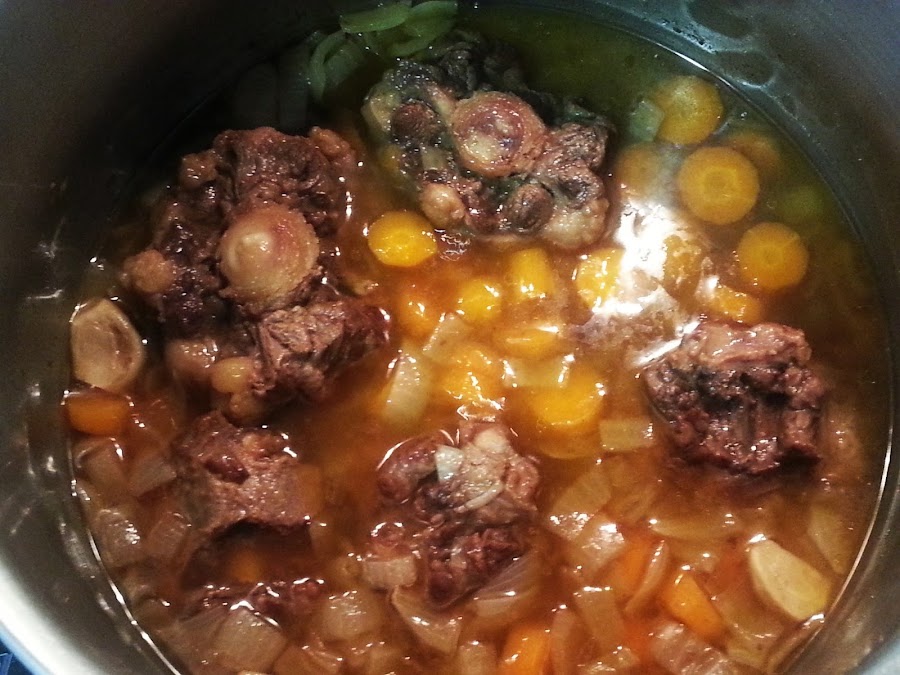 5. - Por último volvemos a echar la cola de toro, añadimos el vino y las especias y cubrimos de agua a ras de las piezas.