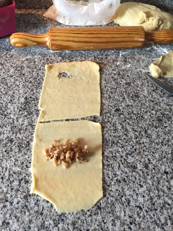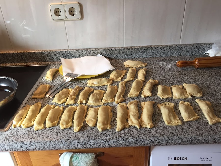 Pasado el tiempo de reposo se extiende sobre la mesa , se corta en porciones y se rellena como si se tratara de empanadillas.