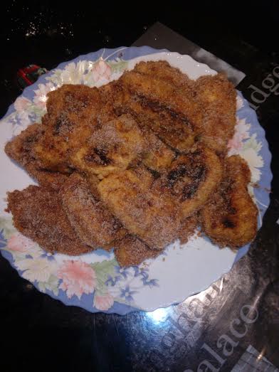 Doramos bien por los dos lados y cuando las saquemos de la sartén las pasamos por la mezcla de azúcar y canela en polvo.