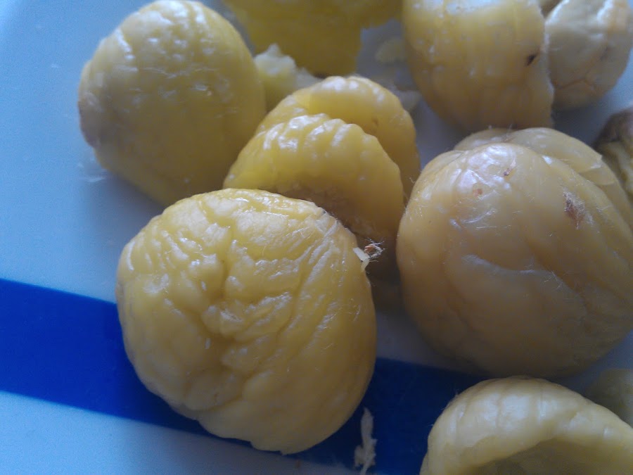 Lo más entretenido de este plato es pelar las castañas, una media horita.....Aunque si os queréis ahorrar tiempo, os aconsejo que compréis las castañas pilongas, que son las castañas ya peladas y secas.