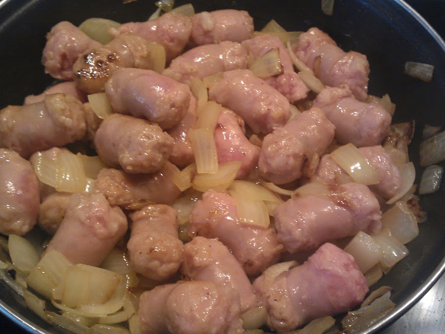 4. - Por otro lado freimos la cebolla con la mantequilla que nos queda y cuando esté empezando a ponerse transparente, le añadimos las salchichas troceadas y rehogamos unos minutos y añadimos a las coles.