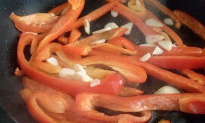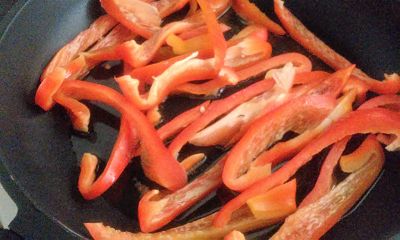 En una sartén pon a calentar aceite en el fondo. Corta el pimiento en tiras. Dora las tiras en la sartén.