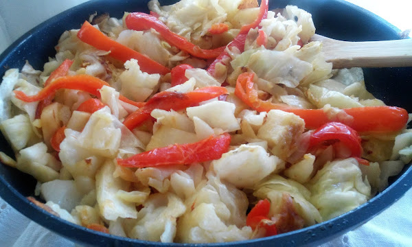 Cuando los ajos estén dorados añade las coles y las patatas. Remueve, rectifica de sal, pon pimienta al gusto. Deja sofreír unos 10 minutos.
