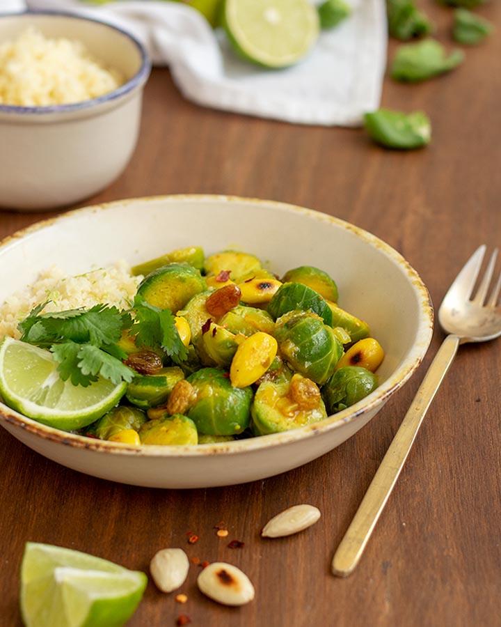 Incorpora las coles de Bruselas y cocina un par de minutos más para que se mezclen bien con la salsa. Sirve las coles con un chorro de zumo de lima por encima y cilantro o perejil fresco picado. Acompaña el plato con falso arroz de coliflor, arroz cocido, cuscús, quinoa u otros granos.