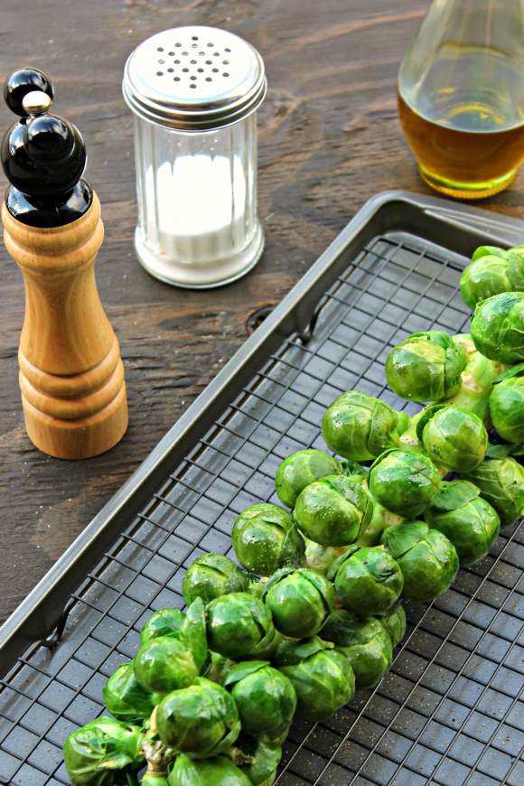 If you did not buy the stalk you can now cut brussels sprouts in halves so they become tender when roasted. If you bought the stalk and want to cook the sprouts in the stalk wrap it all in plastic wrap (the microwave safe kind) and microwave the whole stalk for 3 min. This will help them get tender without having to cut them in half.