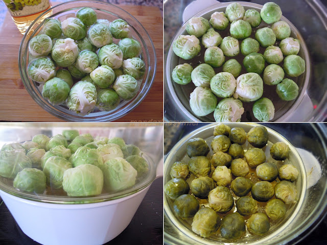 Escurre y lávalas antes de cocerlas. Ahora tienes dos opciones para cocerlas, una es poniéndolas en agua hirviendo con sal hasta que estén tiernas, o puedes hacerlas al vapor que es como las he hecho yo, de esta manera no se pierden las vitaminas de las coles porque no hierven, no recogen agua en su interior y están cocidas en unos 20 minutos.