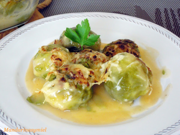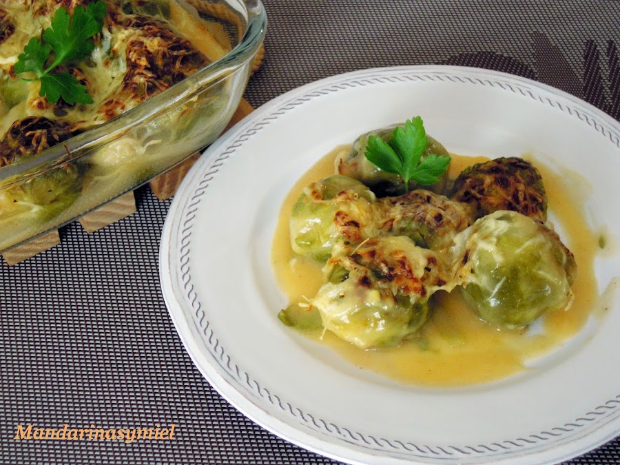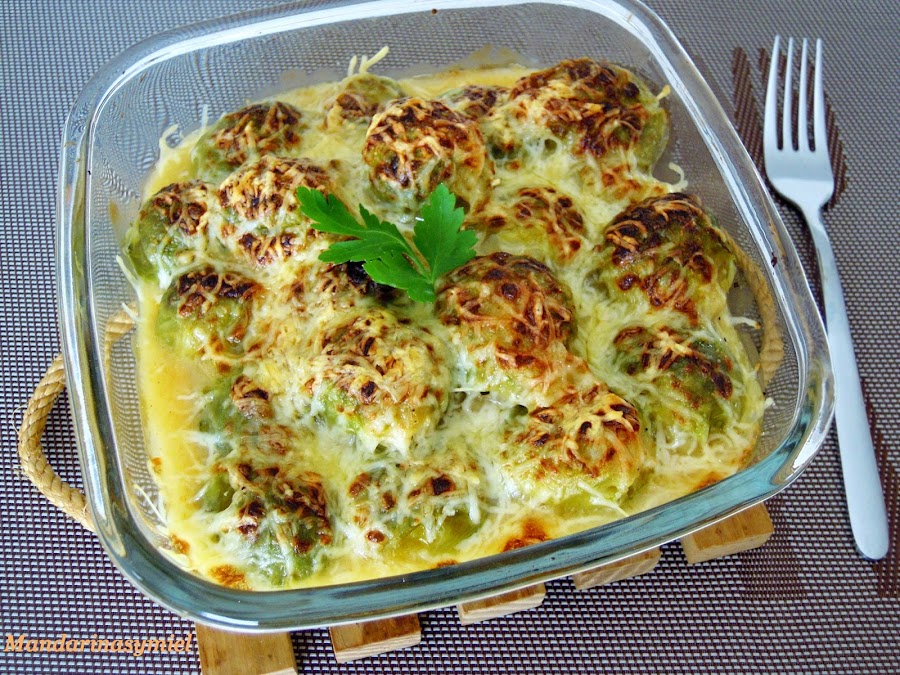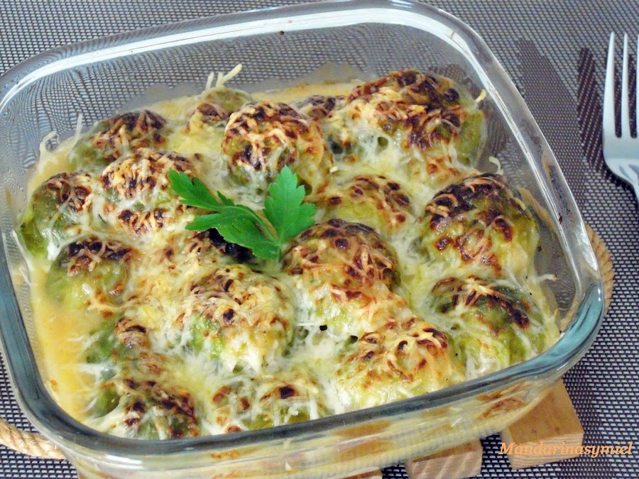 Cuando esté lista la bechamel, échala sobre las coles de Bruselas.