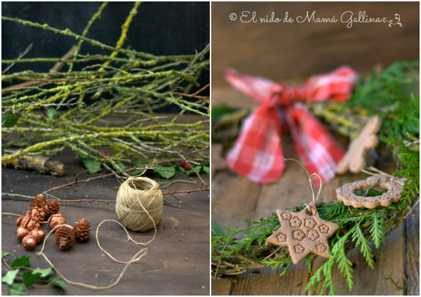 Inspirándome en estos elementos he hecho este adorno navideño y esta corona de ramas, adornadas con galletas de pasta de sal. El año pasado descubrí esta pasta y es lo más de lo más: barata, ecológica, no tóxica, no se estropea y fácil de manejar; ideal para utilizar con niños y siempre a punto en cualquier momento. Una vez seca, esta pasta puede pintarse con pinturas acrílicas y dura muchísimo (no se exactamente cuanto, pero lo que hice el año pasado está igual).