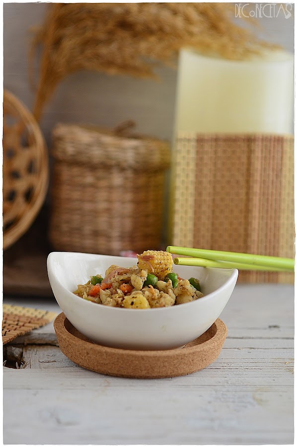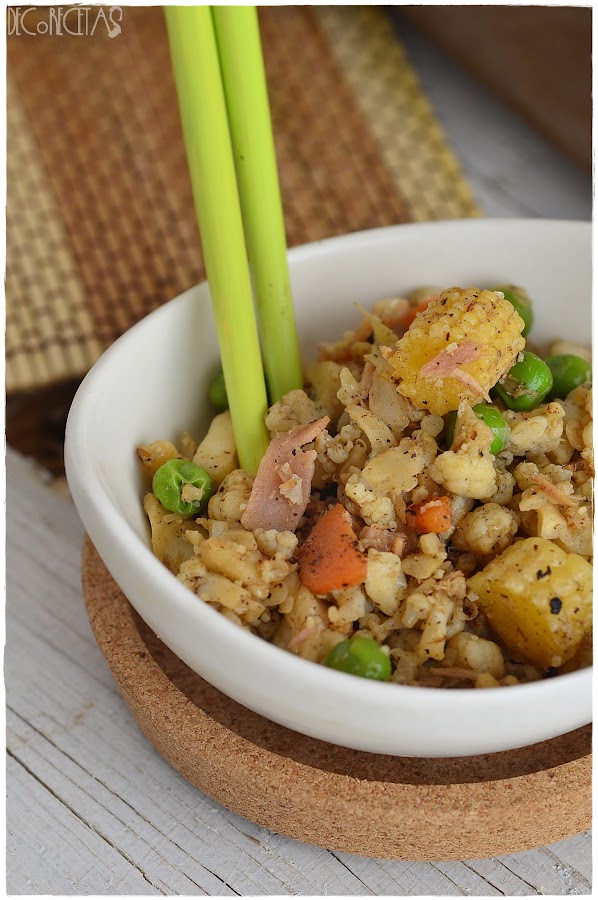 Tan sólo debemos triturar la coliflor hasta que quede del tamaño de los granos de arroz. Cocemos unos minutos guisantes y zanahoria triturada al gusto. En un wok, con una gota de aceite, agregamos la coliflor triturada y cocinamos durante varios minutos sin parar de remover para evitar que se queme. Agregamos las verduras cocidas y escurridas, trocitos de jamón cocido, atún, mazorquitas en conserva y una tortilla francesa en trocitos. Por último, añadimos un chorrito de salsa de soja, integrando bien, y servimos inmediatamente.