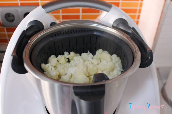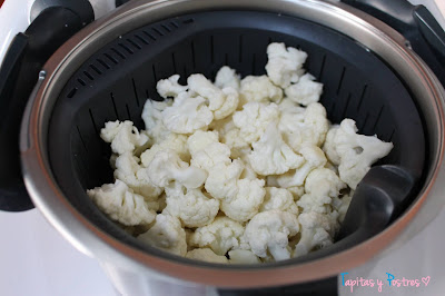 Y la coliflor, lavada y cortada en "arbolitos". La ponemos en el cestillo y programamos 10 minutos, varoma, velocidad 1.