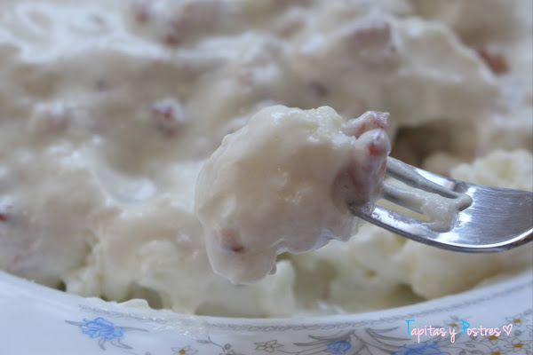 Si no tenemos thermomix, haremos en una sarten un sofrito con la cebolla y el bacon picaditos. Cuando esté listo el sofrito, agregamos la nata (crema de leche), sazonamos y cocinamos a fuego suave unos diez minutos. Mientras vamos a cocer en abundante agua la coliflor en ramitos. Al acabar de cocerse la coliflor, escurrimos y servimos con la salsa.
