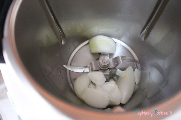 Cortamos la cebolla en cuartos y la ponemos en el vaso de la thermomix. Picamos 5 segundos a velocidad 5. Bajamos los restos de las paredes.